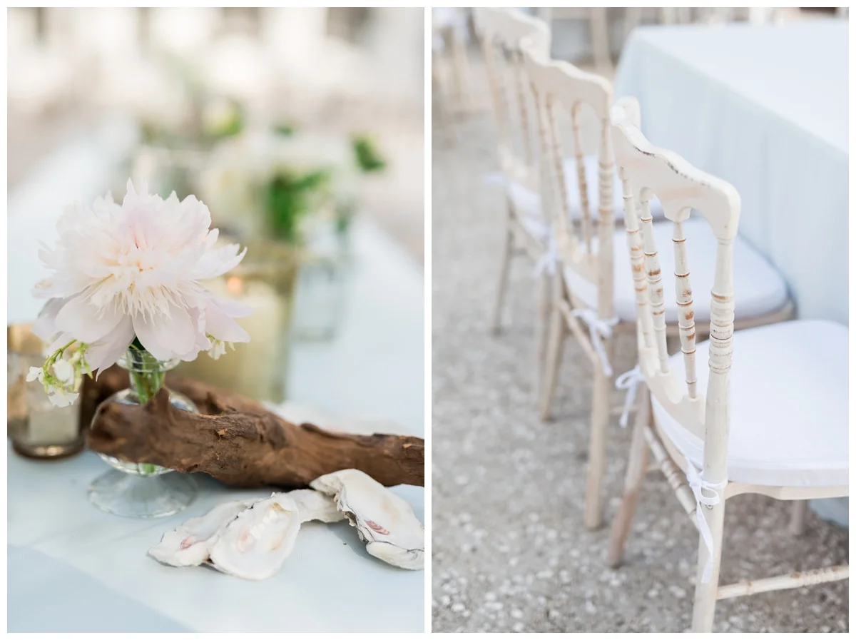 Shawn&Lauren were married on the front lawn looking towards the dock at Lowndes Grove and had a reception to follow on the back patio. There was a live band that entertained and kept the dance floor completely packed throughout the night, they were so talented and full of energy! Oysters were served during cocktail to remind everyone how Shawn&Lauren had their first conversation that brought us all together. The decor and decorations Shawn&Lauren chose for the reception were so beautiful. They tied in a nautical seashell theme with beautiful vases of white and blush floral arrangements all along the guest's seating tables.